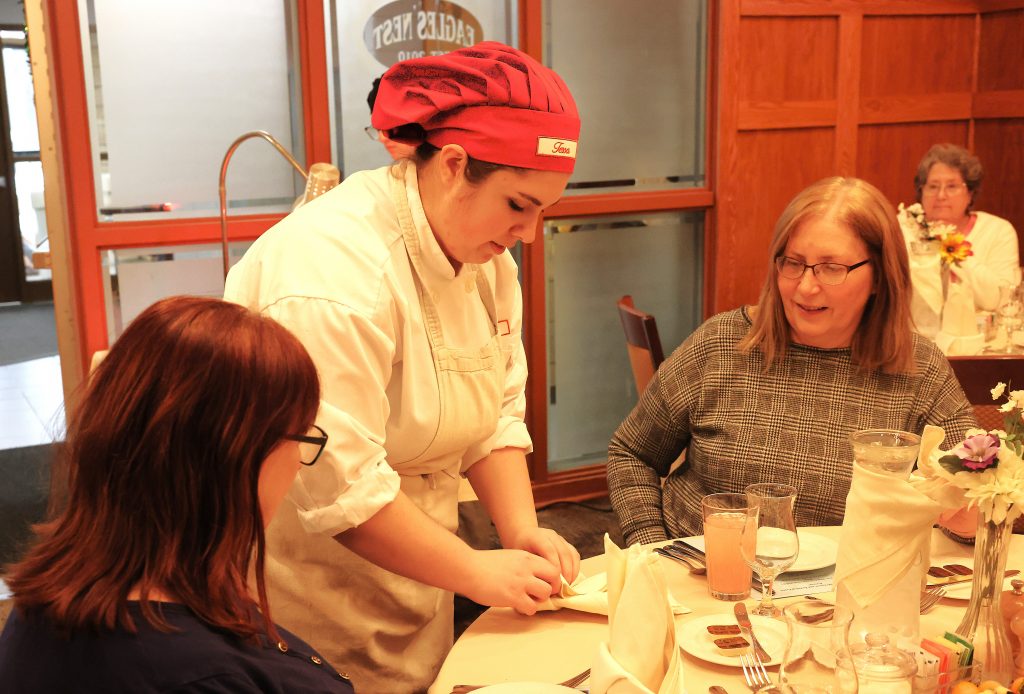 Attendees enjoyed a variety of dishes that showcased the culinary talents of these aspiring chefs. One notable moment featured Tessa Evens, a student in the program, demonstrating the art of napkin folding to Joyce Stehle, the President of the Port Allegany Women’s Club, and Sharen Horvath, the Vice President. This hands-on interaction emphasized the educational aspect of the event, highlighting how the Culinary Arts Program prepares students for real-world experiences in the hospitality industry.