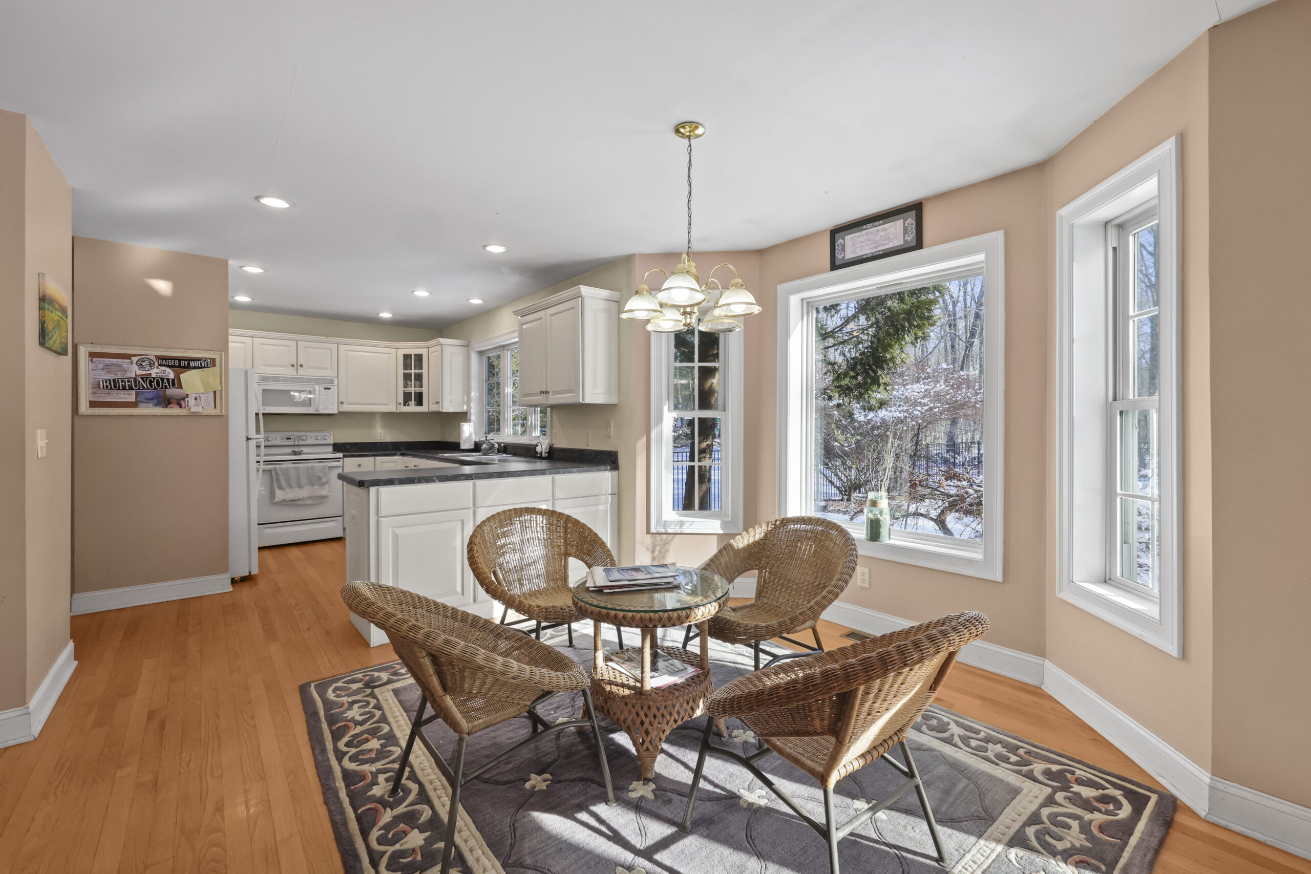 Inside, the home maintains a traditional Colonial layout that balances openness with structure. An entry hall leads to a formal dining room and a spacious living room, both lined with large windows to showcase natural light and views of the surrounding greenery. This flexible design is ideal for both intimate dinners and larger gatherings, enhancing the livability of the home.