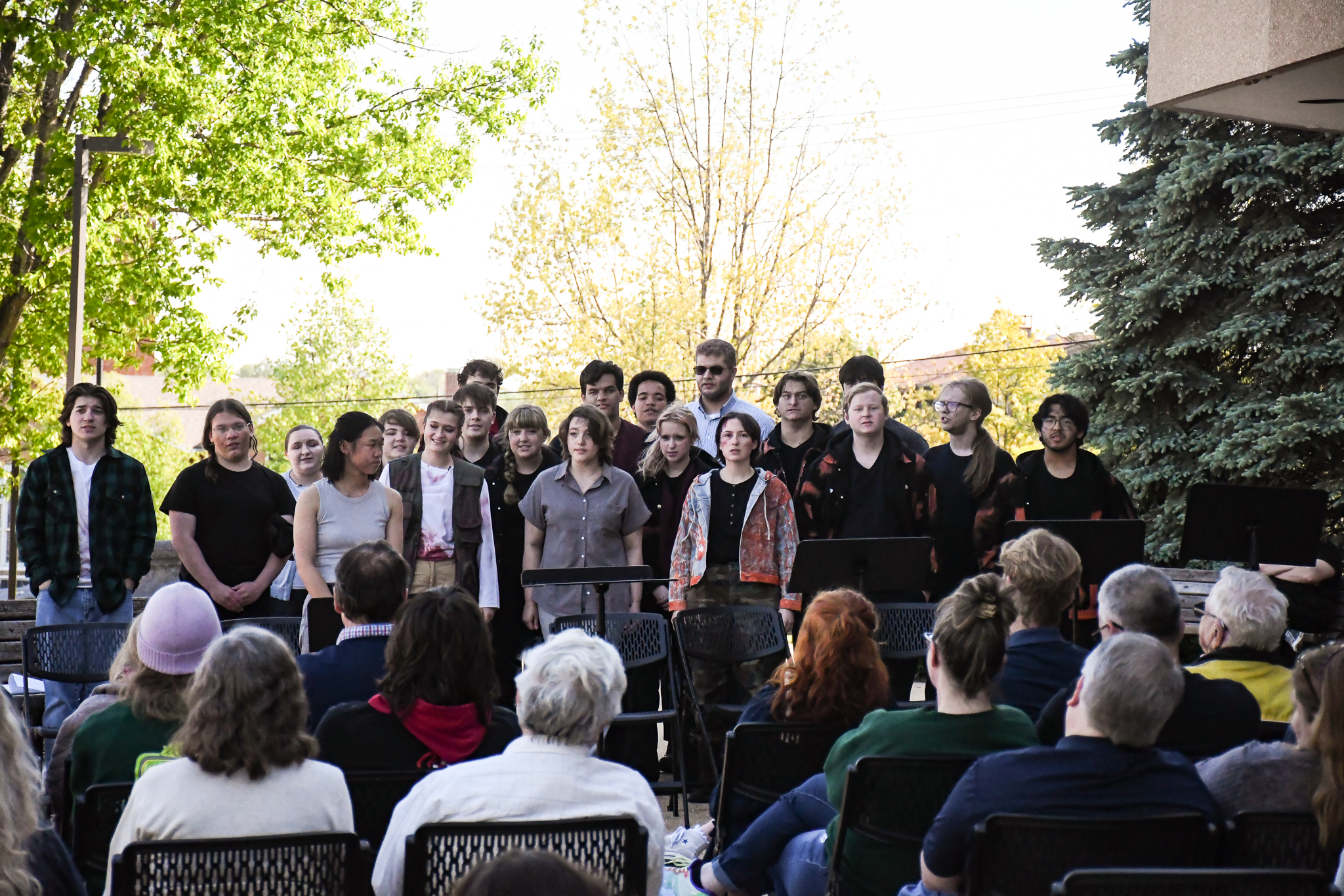 Faced with losing the audience and halting the production, students and faculty made a swift decision to relocate the crowd outdoors. Within minutes, chairs were set up under clear afternoon skies, and the performance resumed without the technology it had heavily relied upon.