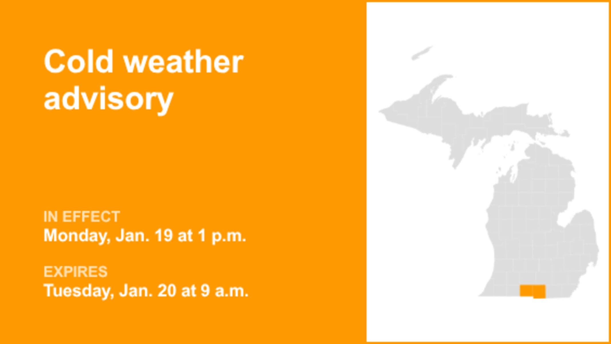 UPDATE: A serious cold weather advisory is now in effect for Branch and Hillsdale counties until 9 a.m. EST on Tuesday, January 16, 2024. The National Weather Service warns of dangerously low wind chills, potentially plunging to 15 to 20 degrees below zero. Immediate precautions are crucial as these extreme conditions pose serious health risks, including hypothermia.