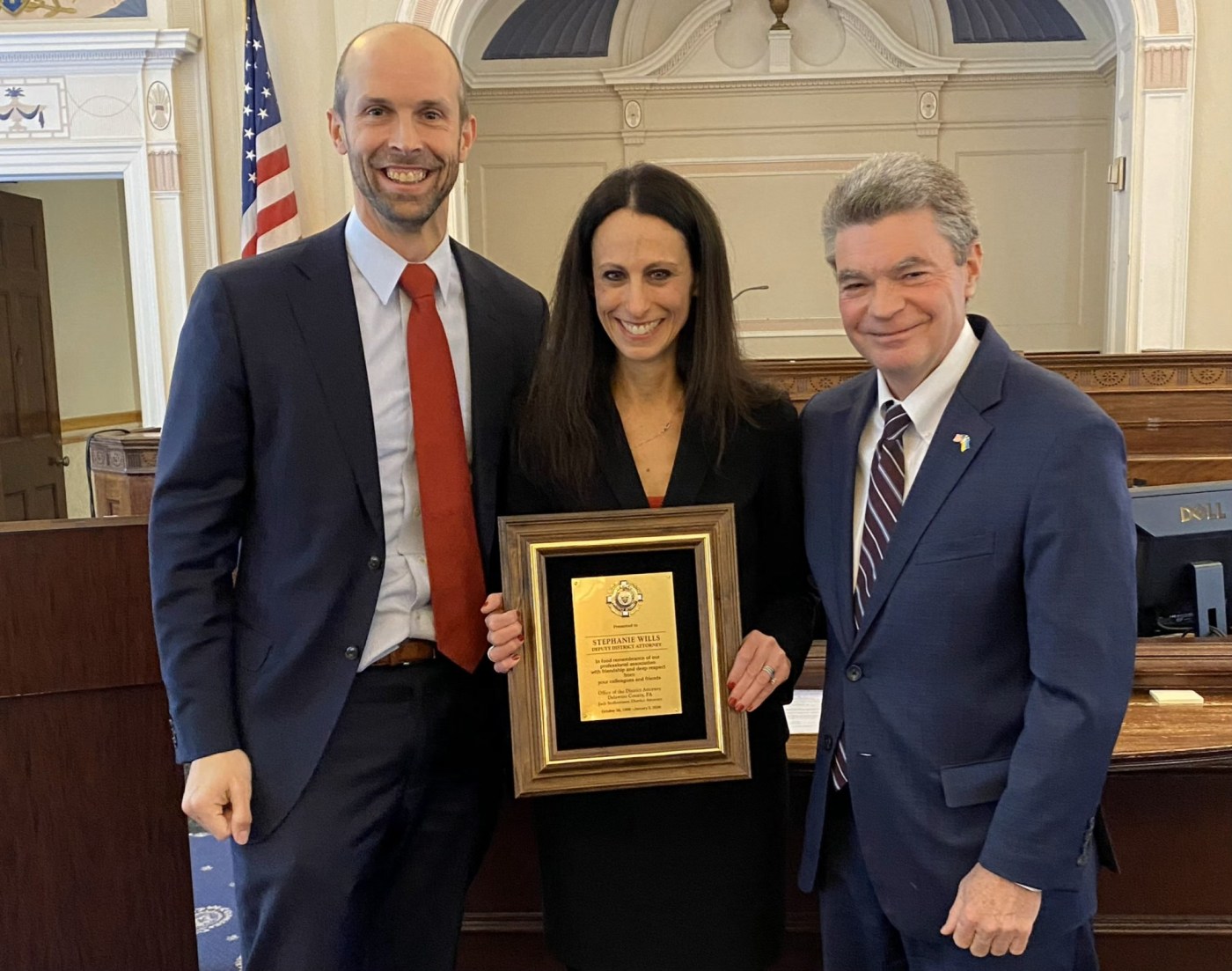UPDATE: Retiring Deputy District Attorney Stephanie Wills received a heartfelt farewell Thursday, as a packed Courtroom 4 in Media, PA celebrated her remarkable 30-year career with the Delaware County District Attorney’s Office. The event was graced by outgoing District Attorney Jack Stollsteimer and incoming District Attorney Tanner Rouse, who both praised Wills for her exceptional service.