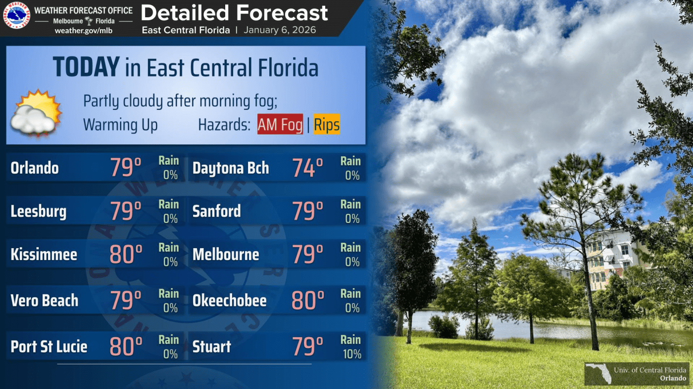 UPDATE: Central Florida is bracing for warmer temperatures and a moderate risk of rip currents today, following a foggy start to the morning. The National Weather Service (NWS) Melbourne confirms that areas will experience dense fog until 9 a.m., making for challenging driving conditions.